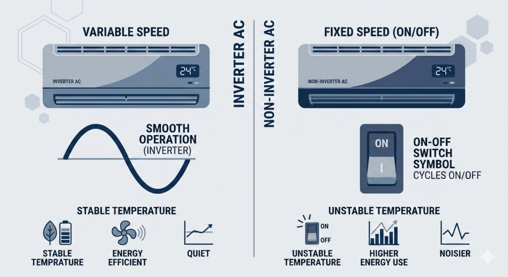 A regular (non-inverter) AC works like a light switch — fully on or fully off. When the room hits your target temperature, the compressor shuts off completely.